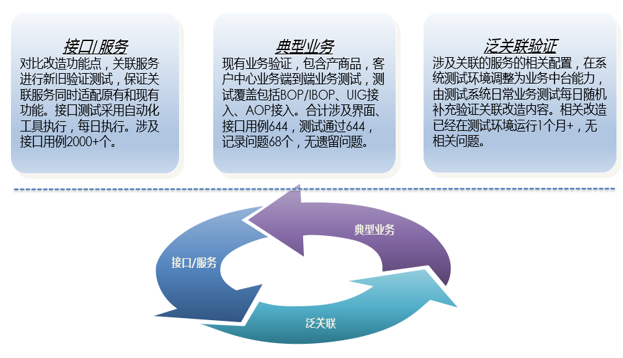 端到端测试,主要是涉及到微服务改造的业务场景及关联的TOP业务场景(以生产近3个月交易排行为准),采用现有的自动化平台已有的用例场景+日常新业务泛关联测试,持续运行,保证测试质量。
