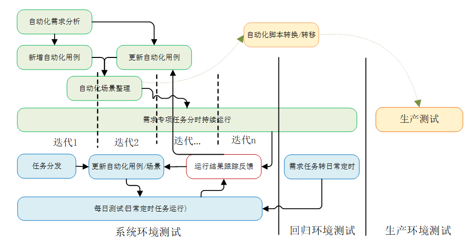 除此之外,考虑中台为全新的环境,增加性能测试和生产测试,其中包括针对微服务特点进行的测试。这部分由测试人员通过自动化工具实现测试。