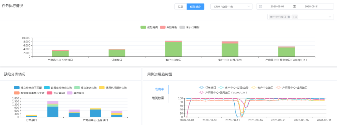业务中台一期CRM-3中心,目前共完成多轮次测试和生产测试,完成API测试800+,90%API&服务由自动化测试覆盖完成,日均执行测试用例260+。总体检错率25%左右,缺陷数(500+)/测试用例(2000+)。同时,根据项目需要,完成多轮性能和生产测试。