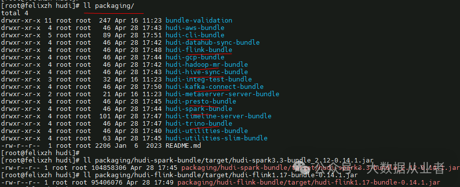 [root@felixzh]# git clone -b release-0.14.1 https://github.com/apache/hudi.git[root@felixzh hudi]# mvn clean package -Dmaven.test.skip=true -Dfast -Dspark3.3 -Dscala-2.12 -Dflink1.17 -Pflink-bundle-shade-hive3 -Drat.skip=true -Dcheckstyle.skip