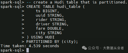默认创建分区表、类型为cow。可以通过TBLPROPERTIES (type = 'mor')可以设置参数。