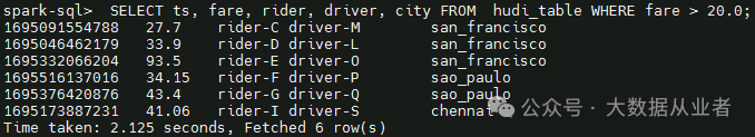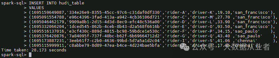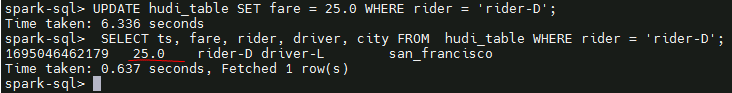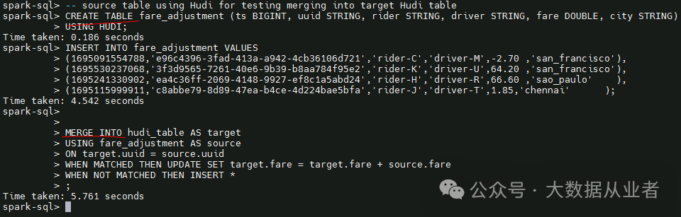 创建fare_adjustment表,插入4条数据。然后,将fare_adjustment与hudi_table表进行merge,且根据uuid将两表fare求和,赋值到hudi_table表的fare列。