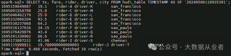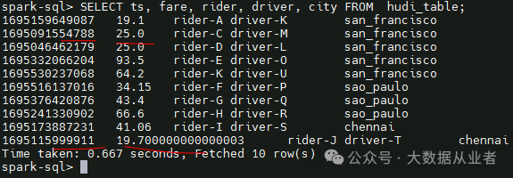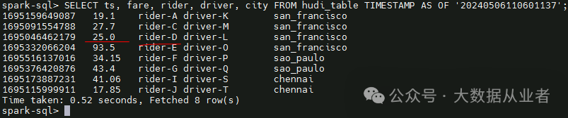 hudi_table原表8条数据,fare_adjustment表4条数据。其中,uuid相同的数据为2条,所以merge后共10(8+4-2)条数据,这条数据的fare值为两表fare求和之后的值,如下: