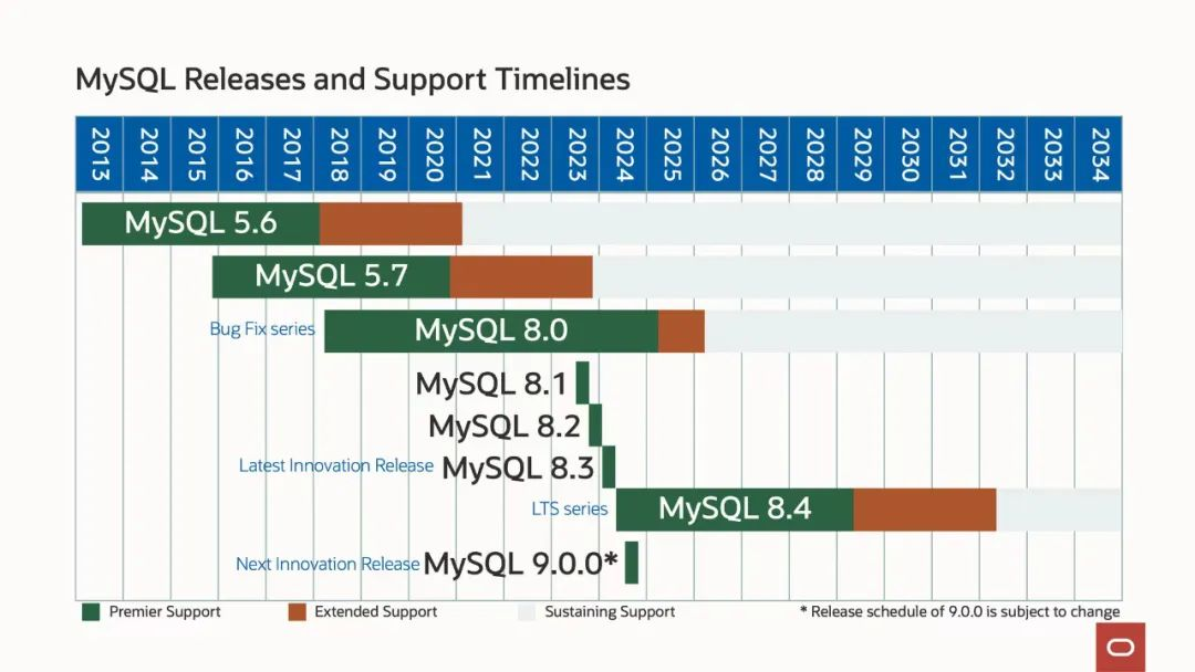 请参考 Oracle 官方提供的 MySQL 各版本生命周期计划(20240430),以更好地安排您生产环境的 MySQL 版本选择。