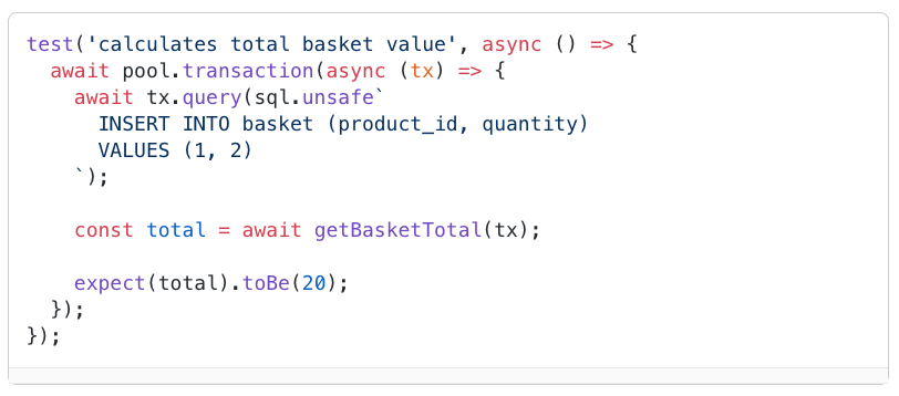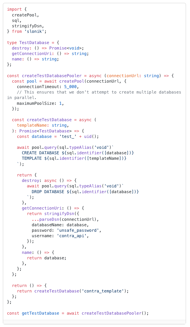 基本思路是在运行测试之前创建一个模板数据库,然后为每个测试从模板数据库创建一个新的数据库。以下是如何管理测试数据库的简化版本:这样您就可以使用 getTestDatabase 来为每个测试创建一个新数据库。destroy 方法可用于在测试运行后清理数据库。结论