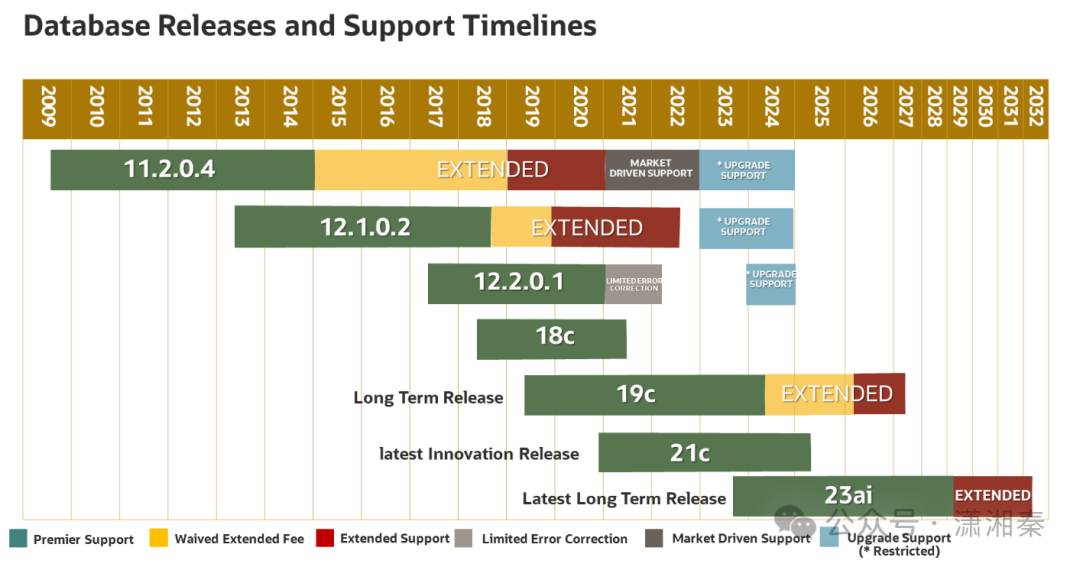 23ai发布后的Oracle版本生命周期图,可以看到23ai是长期支持版本可以到2032年。