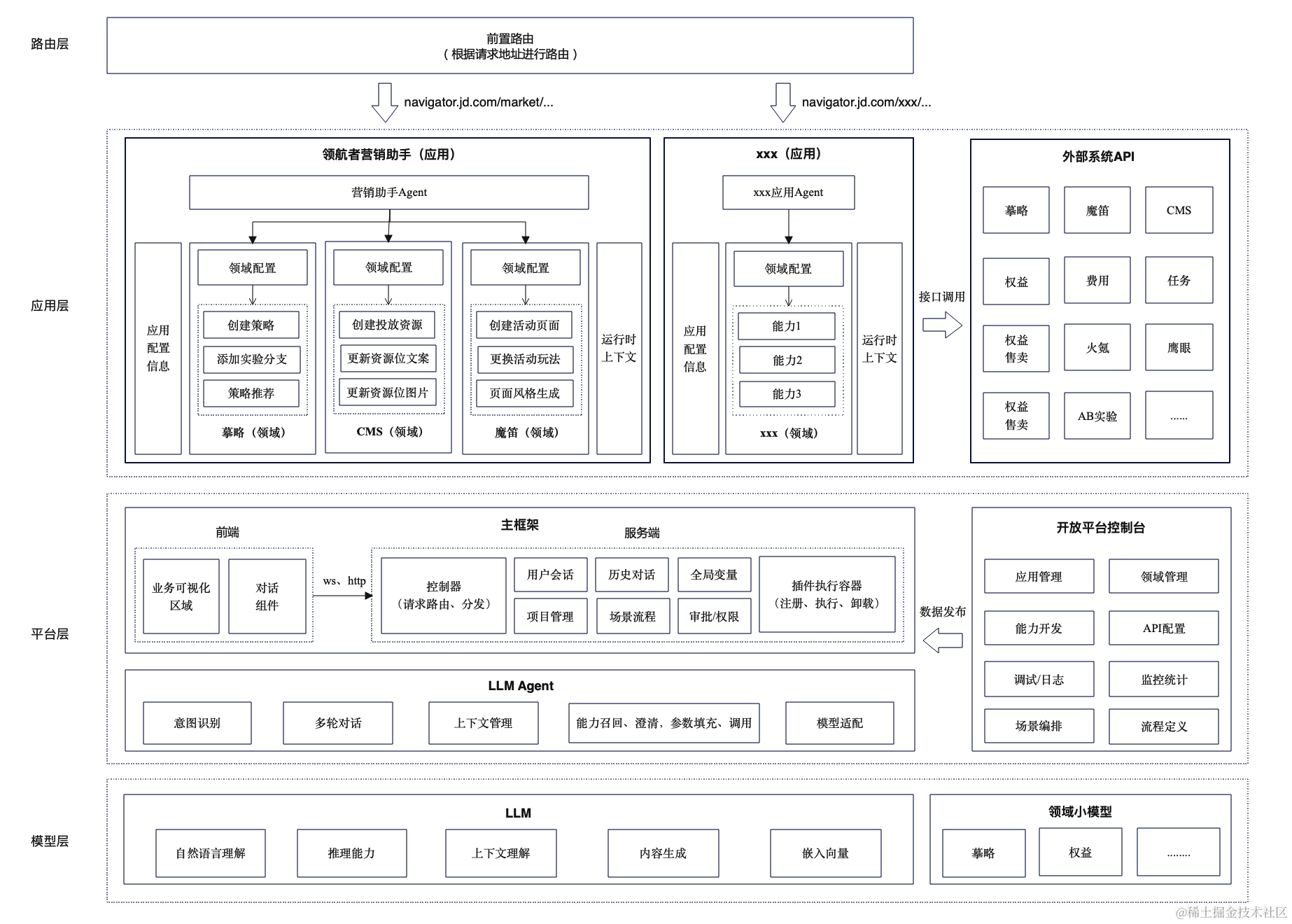 同时,为了让原有应用迅速对接大模型,我们提供了开放平台,降低各应用对接大模型的成本,提高对接效率,整体架构如下图: