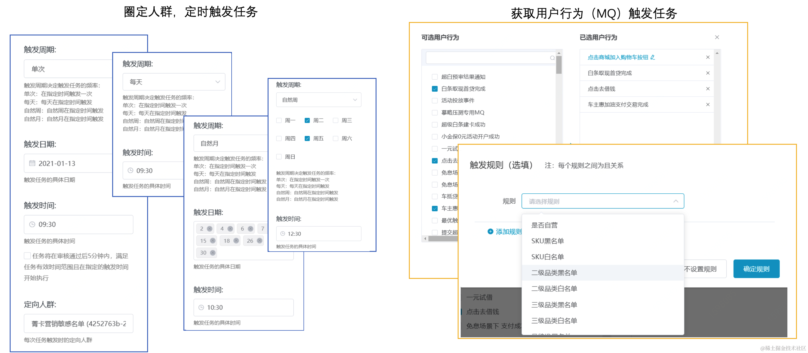 营销策略平台提供了灵活的策略触发机制,包括时间触发、事件触发。其中时间触发提供了灵活的时间周期设置机制,可以按照日、周、月和年等周期按照一定频次和时间触发策略执行。事件触发指的根据用户发生的特定事件触发策略执行,如用户浏览、加购、下单、支付等事件,目前平台支持事件达600多个,涵盖多个业务。
