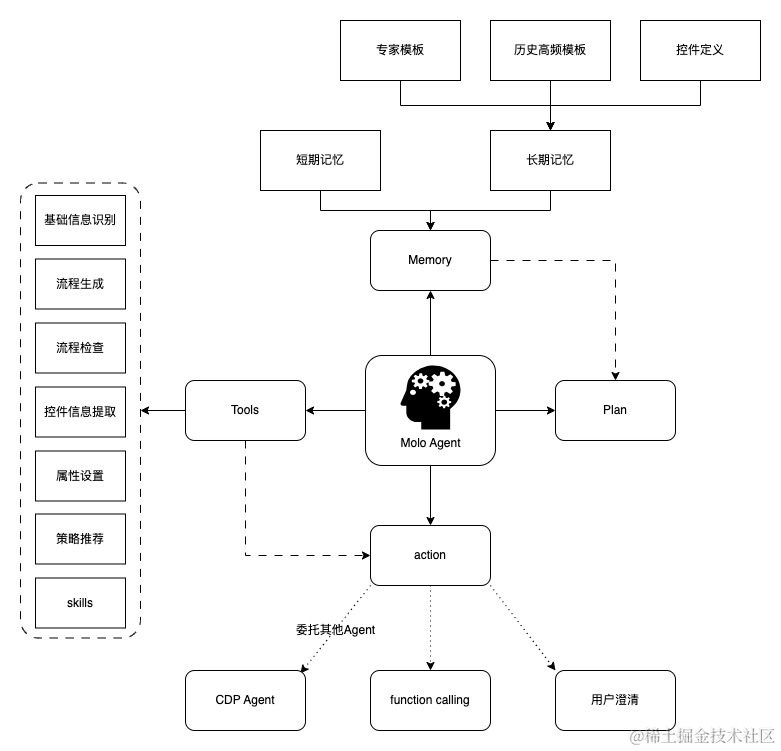 通过专用的策略Agent,我们将专家策略和历史效果优秀的策略沉淀为模板,并将平台上策略生成的规则、组件的元数定义信息、业务规则等内容,做为Agent的长期记忆,将策略搭建过程中的各个步骤,抽象为工具,如策略主干流程生成,控件信息提取生成,策略推荐,流程检查等做为工具,让Agent通过CoT模式根据用户对策略的描述信息去自己思考、推理、规划和决策,结合领域know-how,生成营销策略DSL。在理解的情况下,用户针对生成的策略进行微调就可以满足大部分需求,从而降低运营策略的难度,提升效率和效果。
