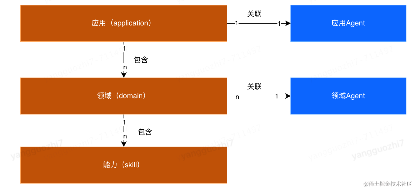 每个应用都会关联一个应用Agent,用于统一处理该应用的请求,并进行路由分发,应用下的每个领域可以有单的领域Agent用于处理该领域下的请求,或者多个领域共享一个Agent。