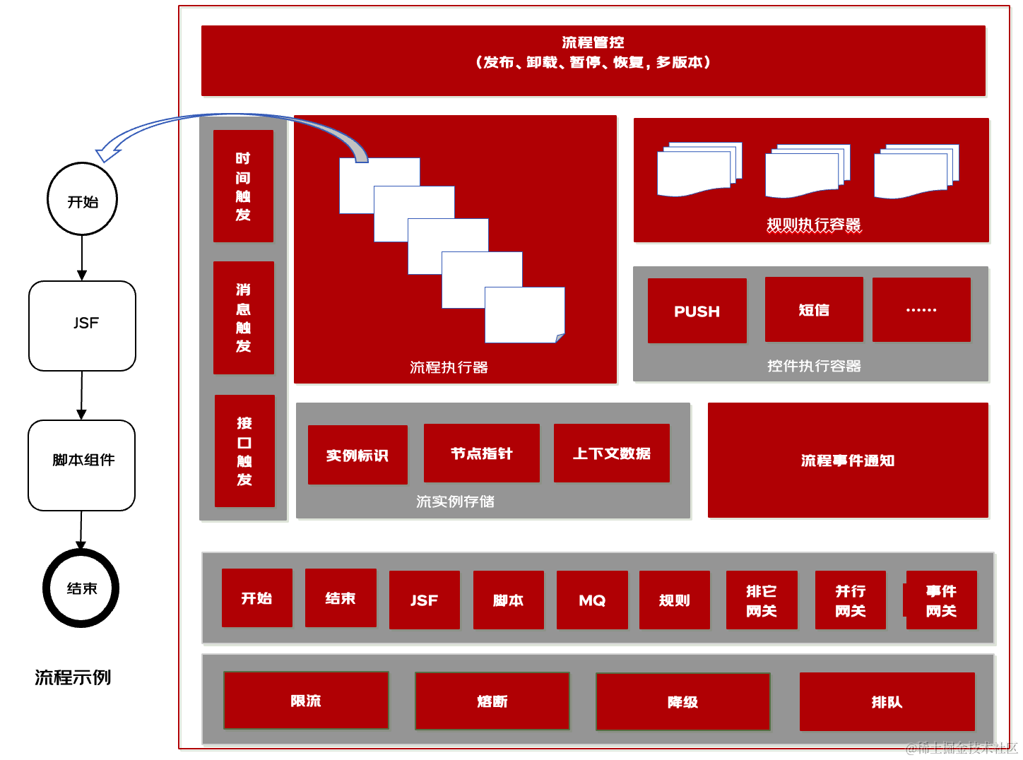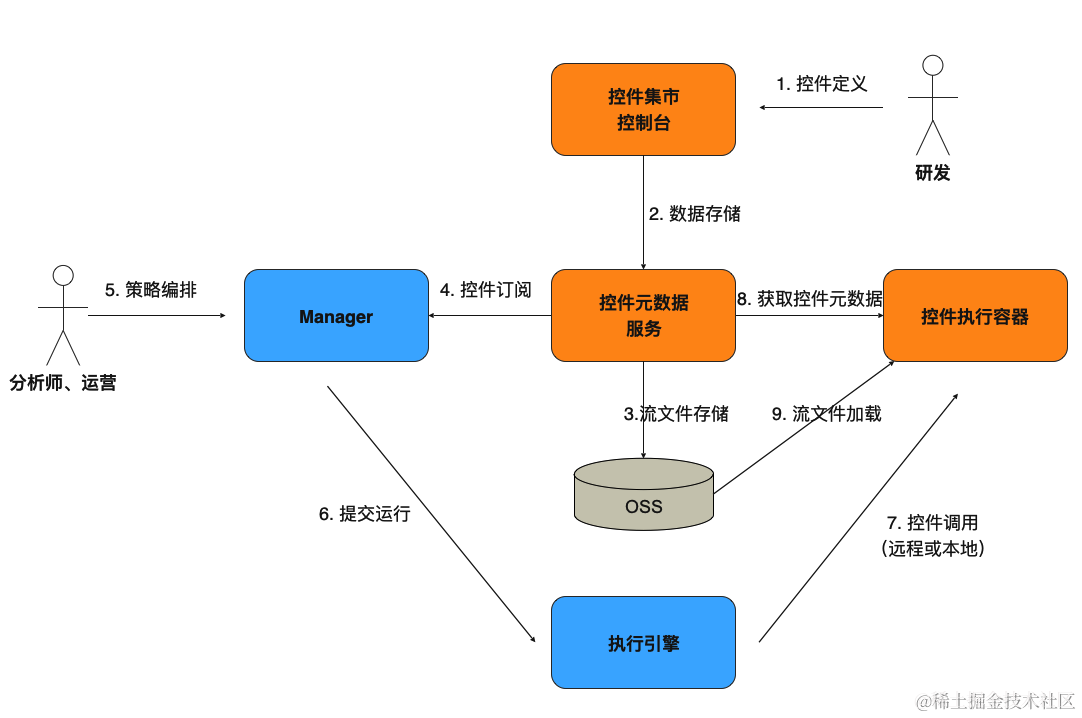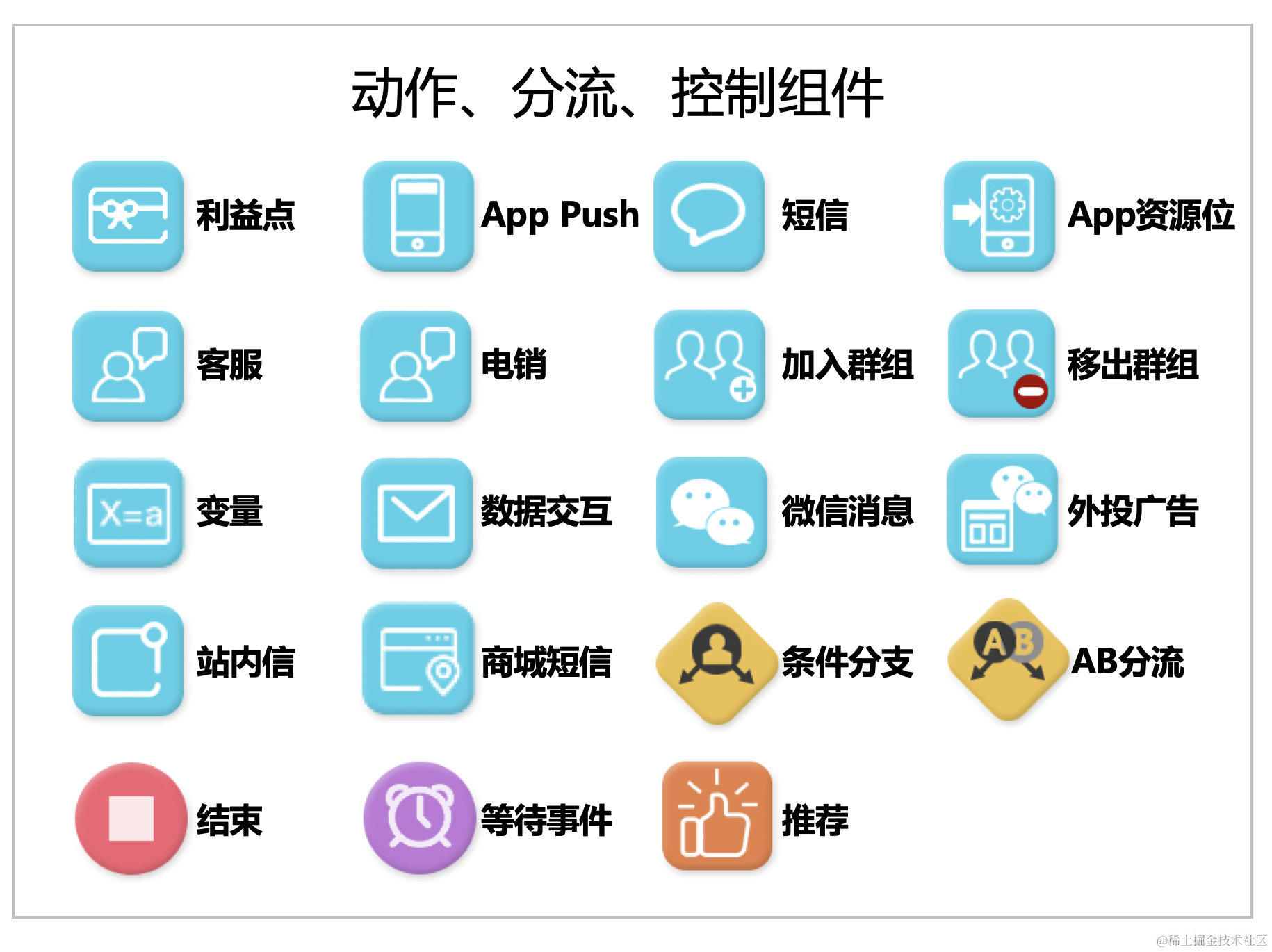平台提供了丰富的组件库,如开始、结束、PUSH、短信、等待等,用户在定义营销策略中直接引用这些组件,方便用户搭建策略。同时研发可以基于标准化的协议快速开发组件并发布,以满足不同的业务场景。