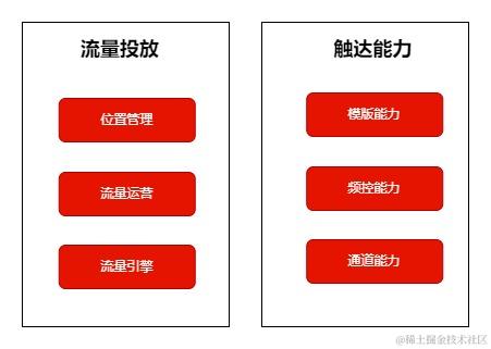 服务于流量的需求方,主要是将各业务线的产品或者活动投放到既定的位置。能力上涵盖了素材库,用来积累常用素材、以及素材的AIGC生成,包括文案和图片,解决了海量素材低成本生产的问题。除此之外,数据方面积累了素材投放的用户效果数据,支持流量的需求方查看素材数据波动及归因分析。素材本身也支持按需自定义组合配置;另外素材的规则配置,包括了定向人群、频控量控、疲劳机制、优先级排序等能力。