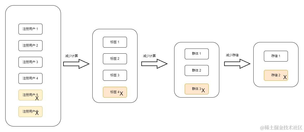 目标:解决三多问题(注册用户多,标签多,群体多),减少数据加工链路各个环节的数据计算量,从整体上减少计算量,缓解计算压力和存储压力。