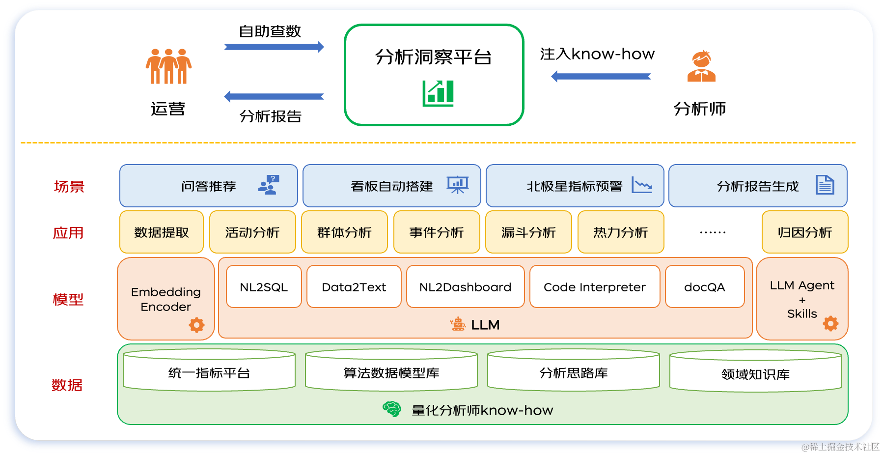 数据基座融合了统一指标平台、数据算法模型、分析思路以及领域知识四要素,汇聚了量化分析师的专业知识和积累的丰富实践经验,这些宝贵的Know-How转化为了一套用户友好的自助式分析工具,确保了数据的准确性和分析的深度。