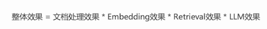 RAG 的效果,其实是和文档处理,embedding,召回,以及最后的大模型效果都关联,可以简单用下面一个公式来表示: