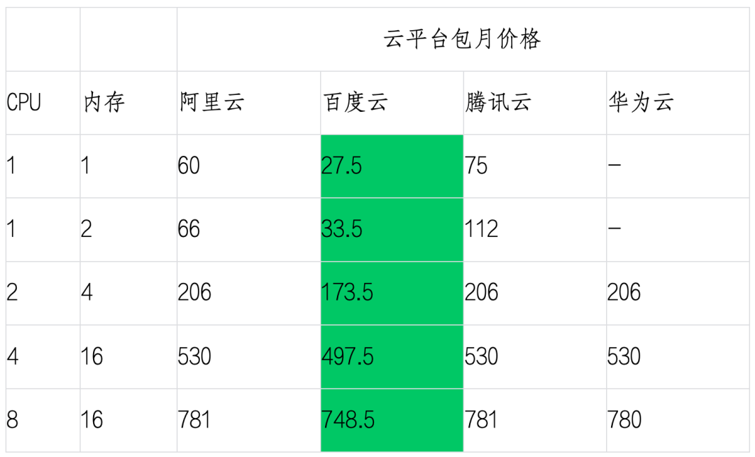 再来看双机高可用独享规格,50GB存储空间的价格,主流规格百度云、华为云的定价是最低的,性价比可以说是很高了。