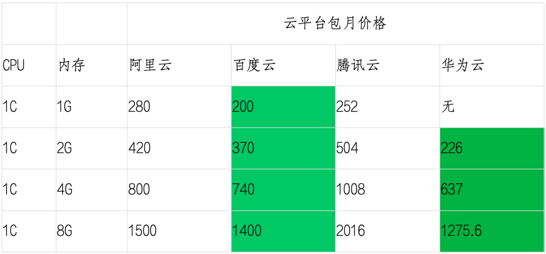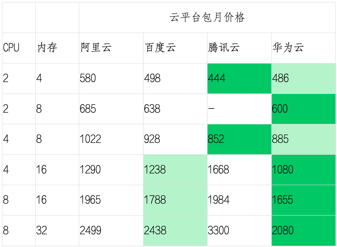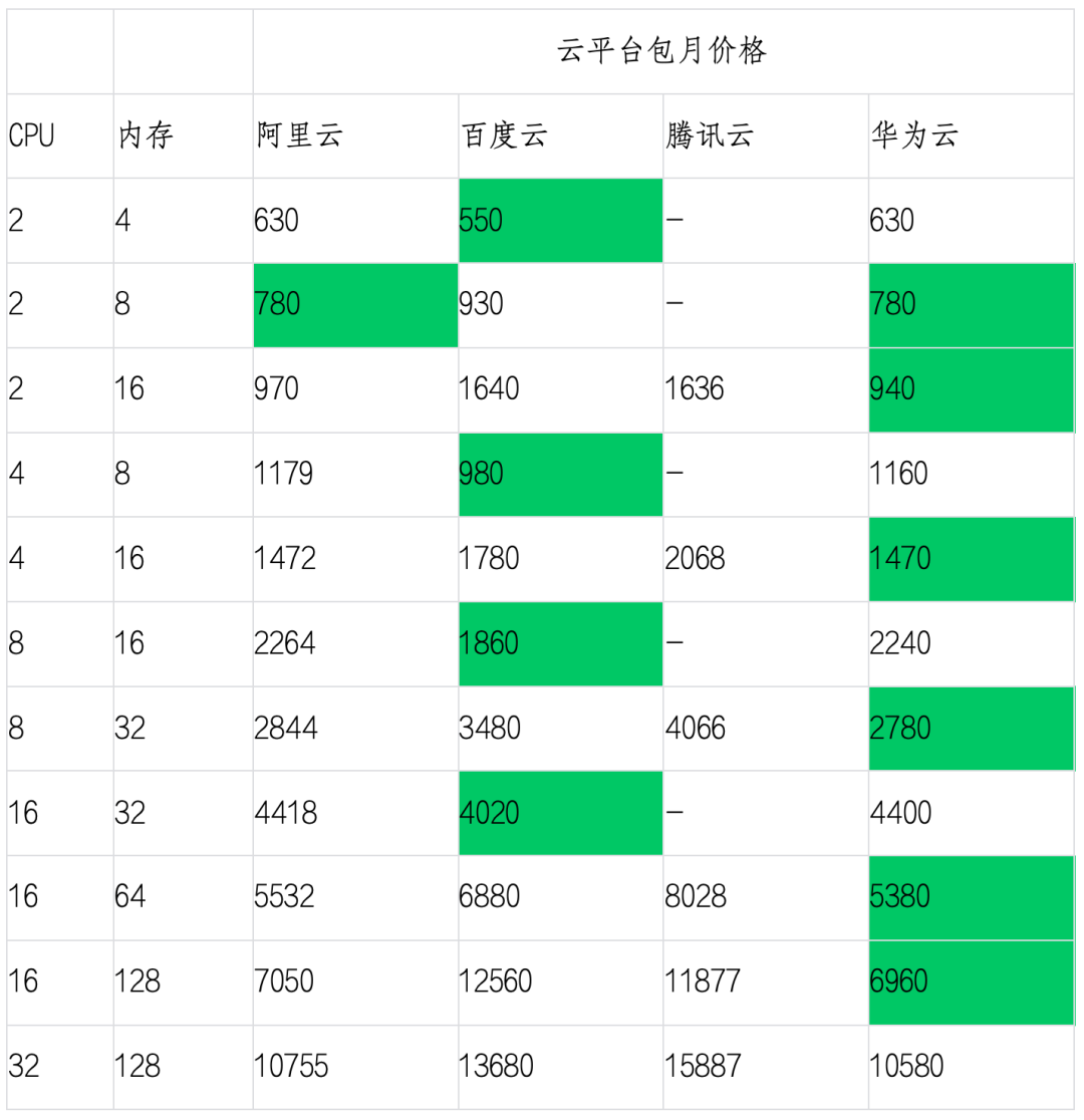 总体来看,各家云厂商价格趋于持平,部分主流商品百度云、华为云更便宜。 RDS MySQL的单机版本,意外的是百度云的价格明显最低,小规格几乎是其他厂商价格的三分之一。 RDS MySQL双机高可用通用规格,华为云的价格最低,百度云、腾讯云其次。 RDS MySQL双机高可用独享规格,主流规格百度云、华为云的定价是最低的,性价比可以说是很高了。 Redis集群版,百度云、华为云最为实惠,紧接就是阿里云和腾讯云。