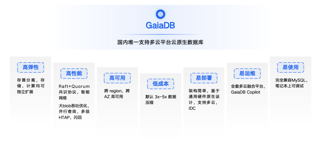 GaiaDB通过内核的深度优化,从一致性协议,网络底层开始优化,从而实现了普通硬件上实现高性能,低成本,易部署,易运维的能力,让企业级云原生数据库进入多云,普惠时代。 GaiaDB 也是目前国内唯一支持多云平台的云原生数据库。