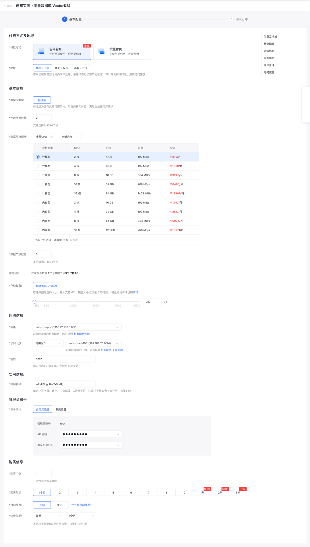 1、创建百度向量数据库实例,注意需要地域,可用区需要和 BCC 保持在同一个 VPC 内。 地址:https://console.bce.baidu.com/vdb/#/vdb/instance/create