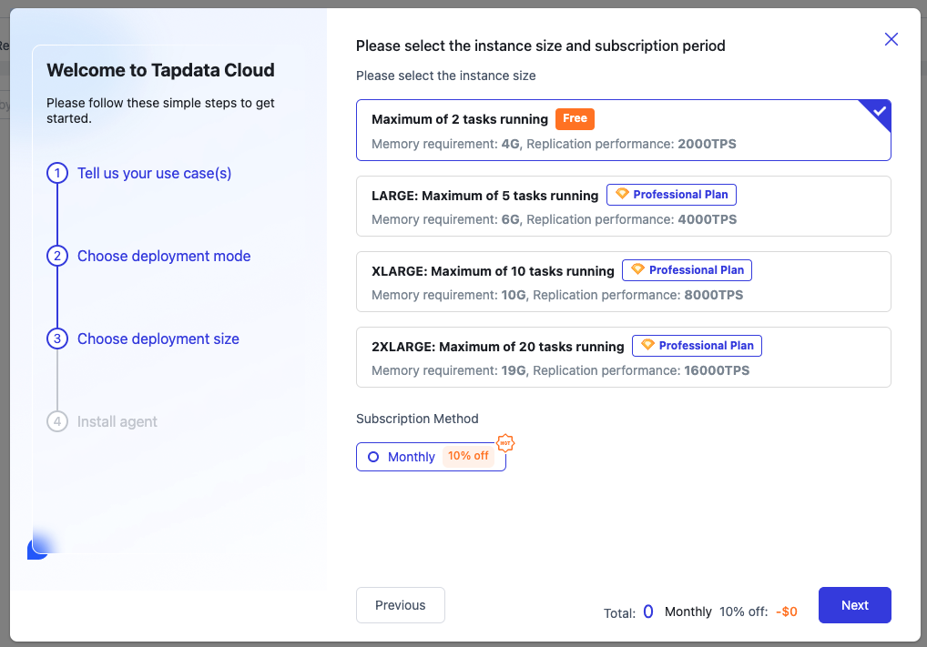 到这里,我们已经准备好了运行数据同步任务的Agent。如果您之前已经完成新手引导流程,再次登录时它就不会自动弹出了,这时您只需要切换到“订阅” -> "添加订阅",然后选择您的部署方式和规格创建实例并完成部署即可。