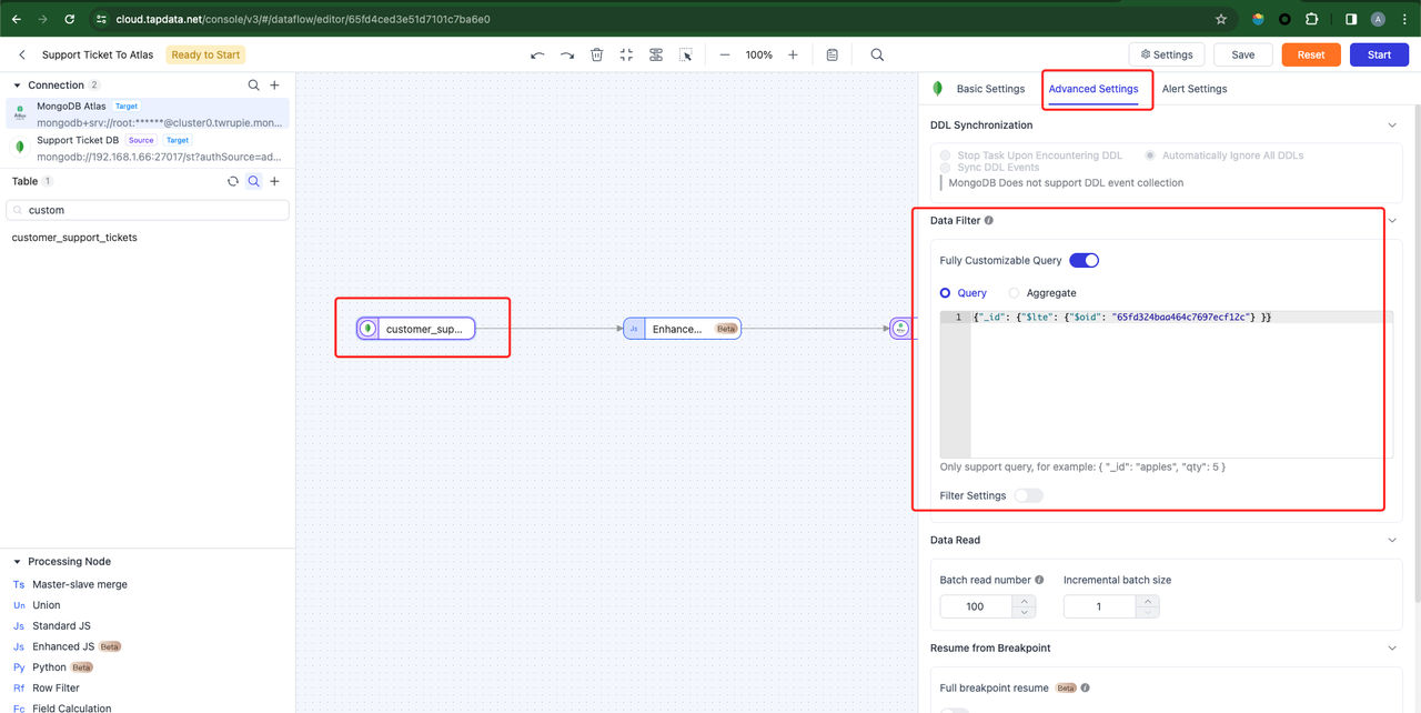 }注意:我们这里使用 Huggingface 免费服务,免费服务会受到速率限制,因此我们这里需要限制一下源库中读取数据行数,操作方法如下,在源库节点添加一个过滤条件,避免频繁调用 Huggingface API,您也可以升级为付费用户来规避API调用限制。如下图,只读取id 小于等于 65fd324baa464c7697ecf12c 的工单记录