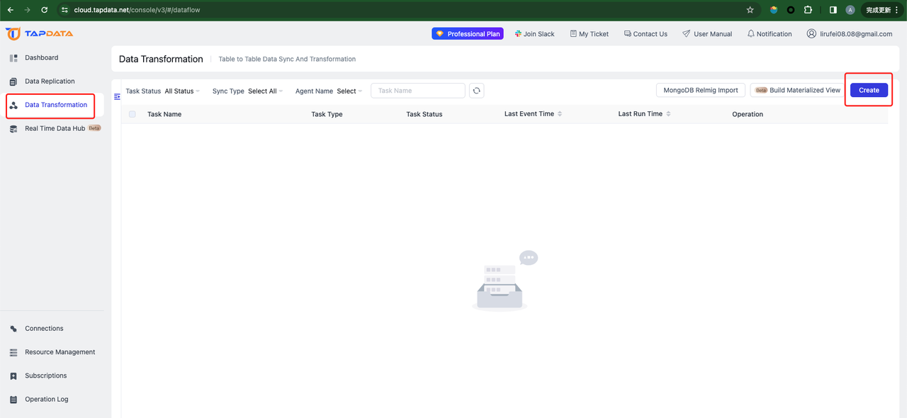 在 Tapdata Cloud 控制台上,打开“Data Transformation”,点击“Create”,创建一个任务