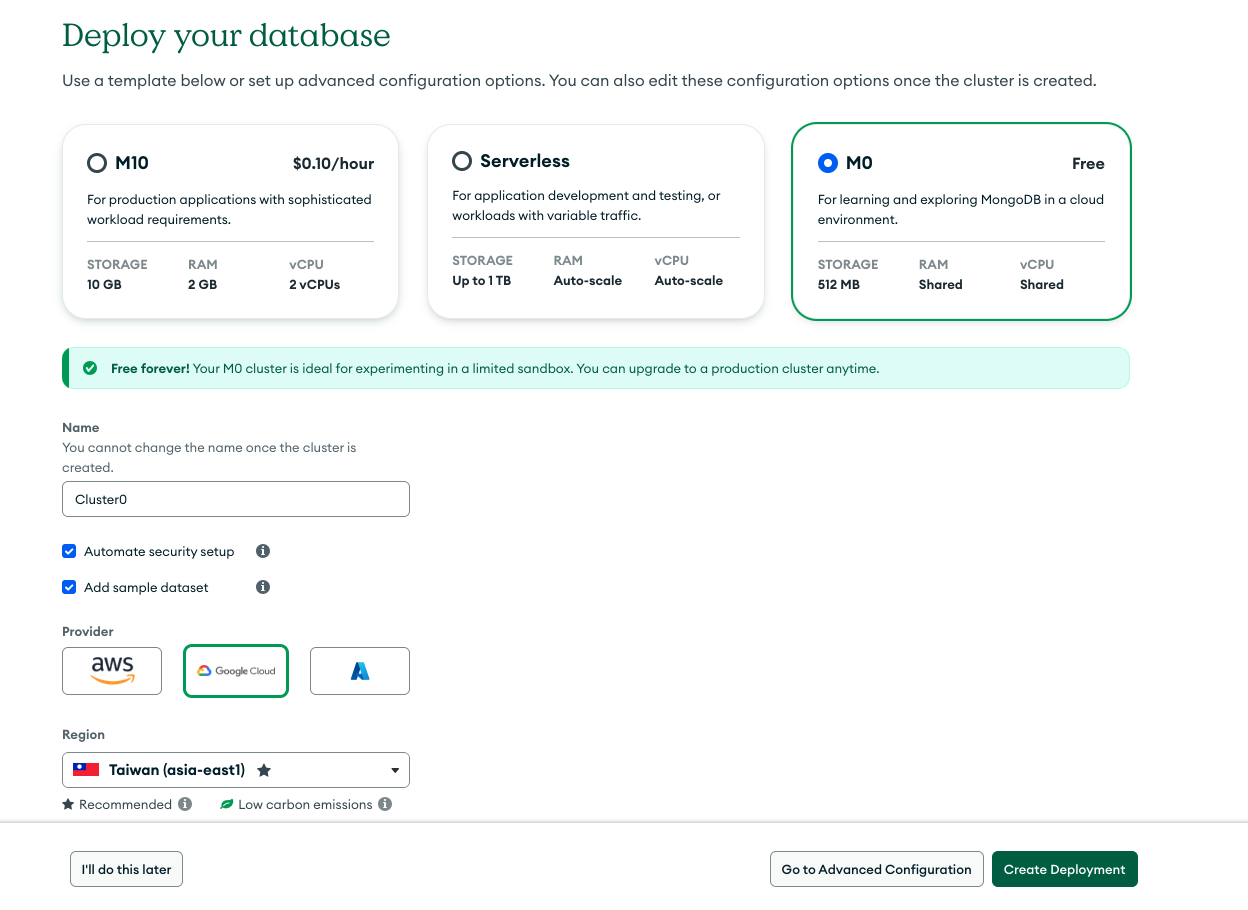 3. 规格选择 M0,集群名称就使用默认名称:Cluster-0,供应商选择 Google Cloud,地区选择 Taiwan,点击“Create Deployment”