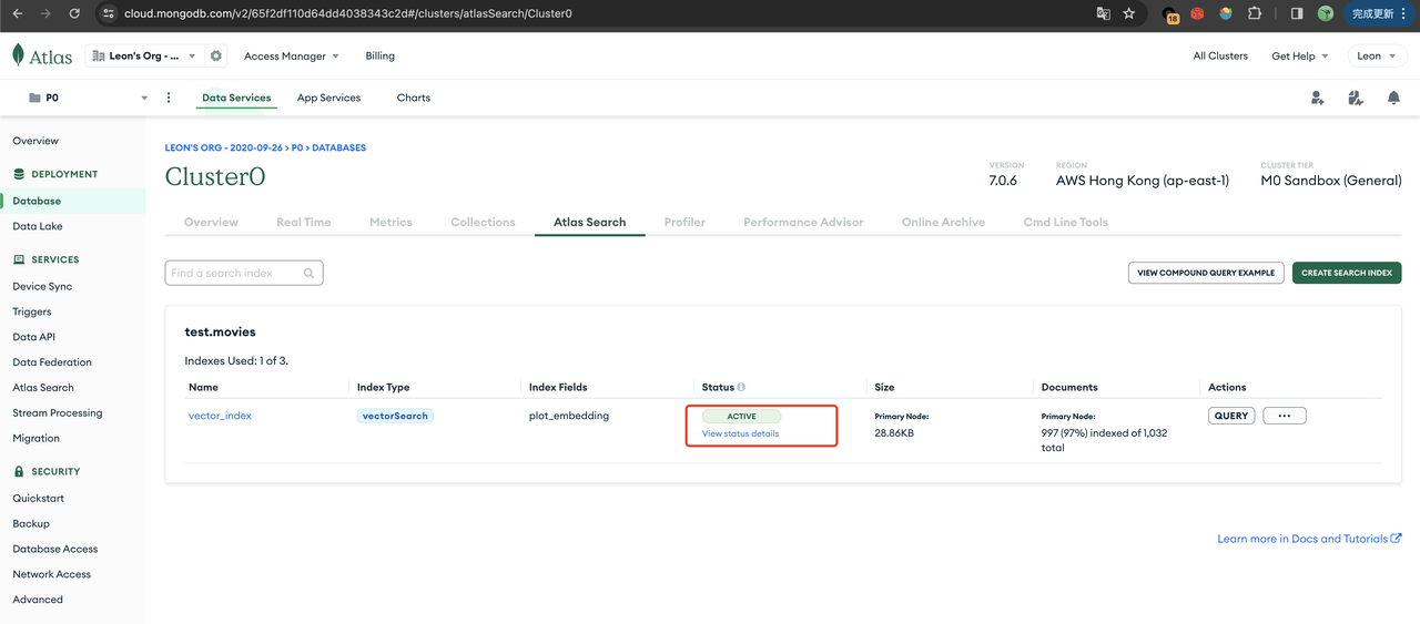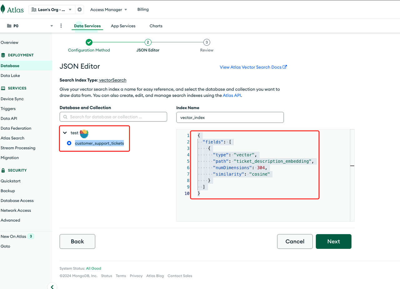 登录 MongoDB Atlas 控制台创建MongoDB Atlas Vector Index