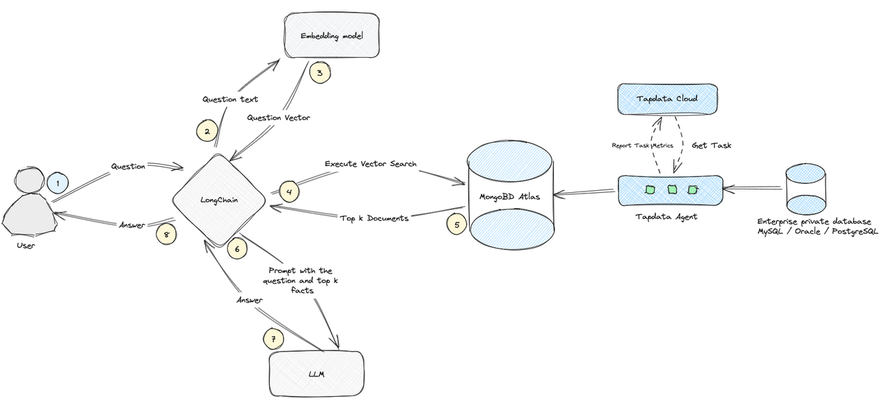 迁移数据到 MongoDB Atlas 后,利用 Tapdata Cloud 的强大功能,我们能够轻松实现工单数据的向量化处理,并通过 MongoDB Atlas 的高效存储和检索能力,为企业提供稳定可靠的数据支持。这种结合大型语言模型(LLM)和检索增强RAG技术的创新应用,不仅提高了工单处理的效率和准确性,还为企业带来了全新的智能化解决方案。