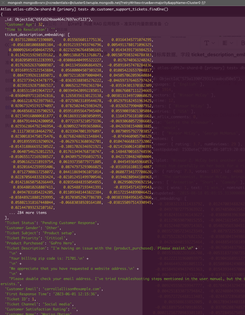 本篇文章我们重点关注上图中 Mongo DB Atlas 及右侧数据准备阶段的处理过程,工单的向量数据准备过程如下:
