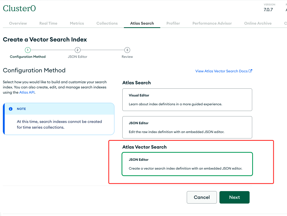 2. 依次点击“Create Search Index” -> “Atlas Vector Search - JSON Editor” -> “Next”