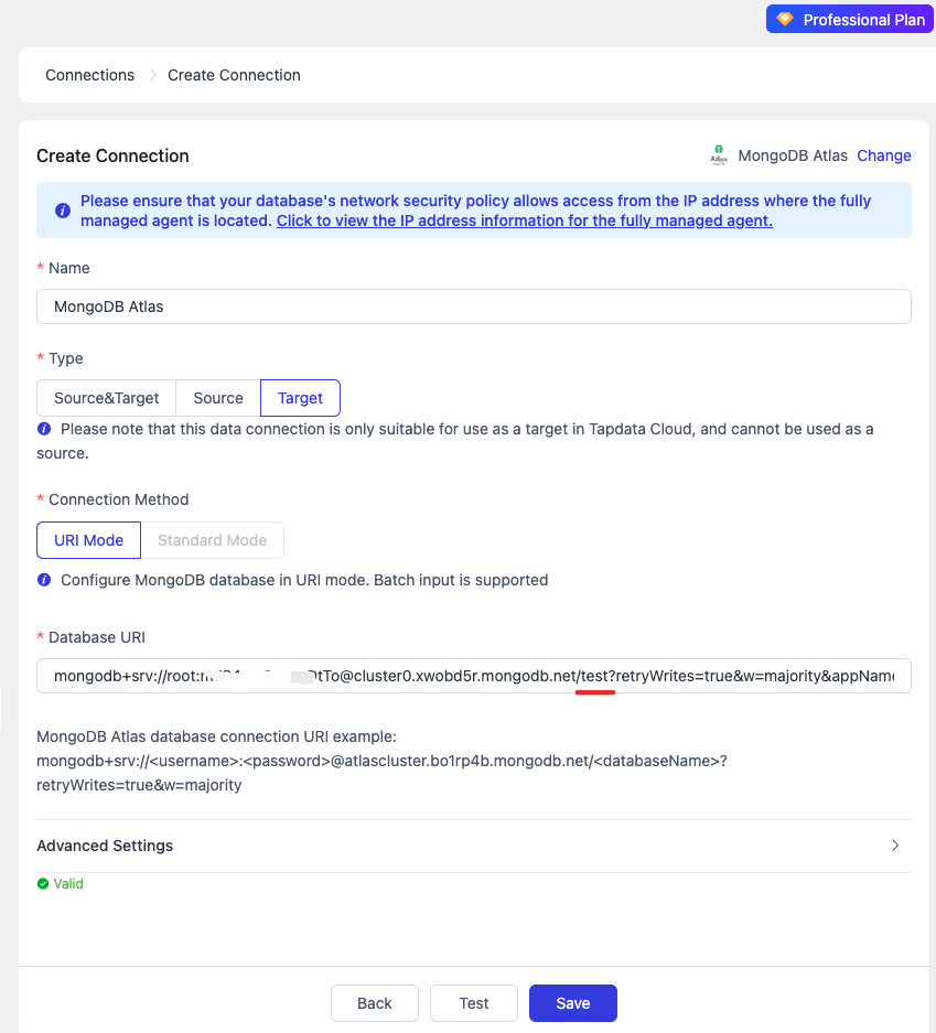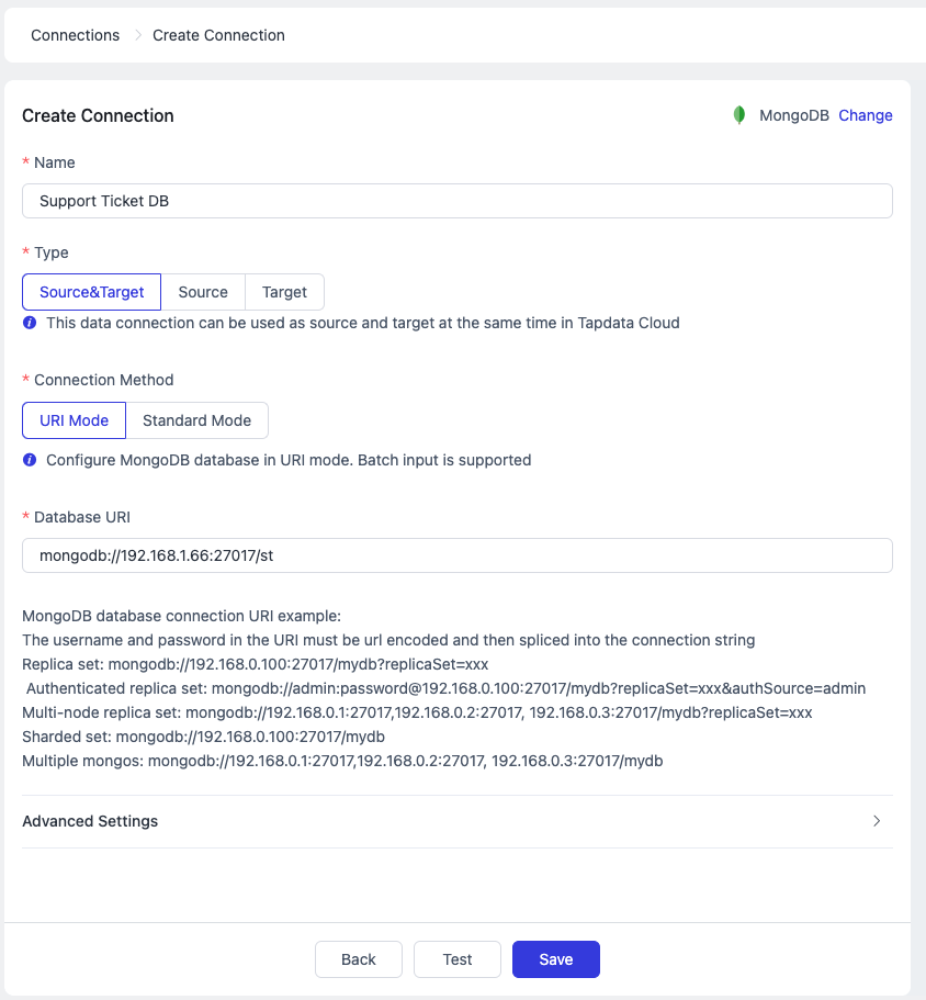 2. 填写名称“MongoDB Atlas”,连接类型选择 “Target”即可,然后复制我们刚才在 Atlas 上创建的MongoDB Database 连接字符串,填写到 “Database URI”,点击“Test”测试连接,点击“Save”保存连接(注意:连接字符串中需要在/后面添加数据库名称,我们这边填写 test )