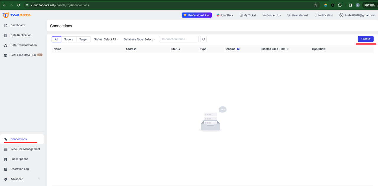 登录Tapdata Cloud 控制台,打开“Connections”连接管理界面,点击“Create” 创建数据源