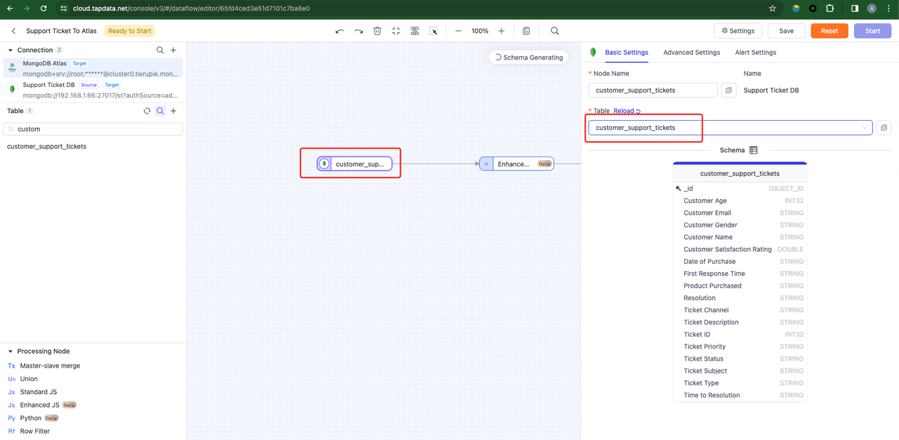 3. 配置源库,选择待处理工单数据表: customer_support_tickets