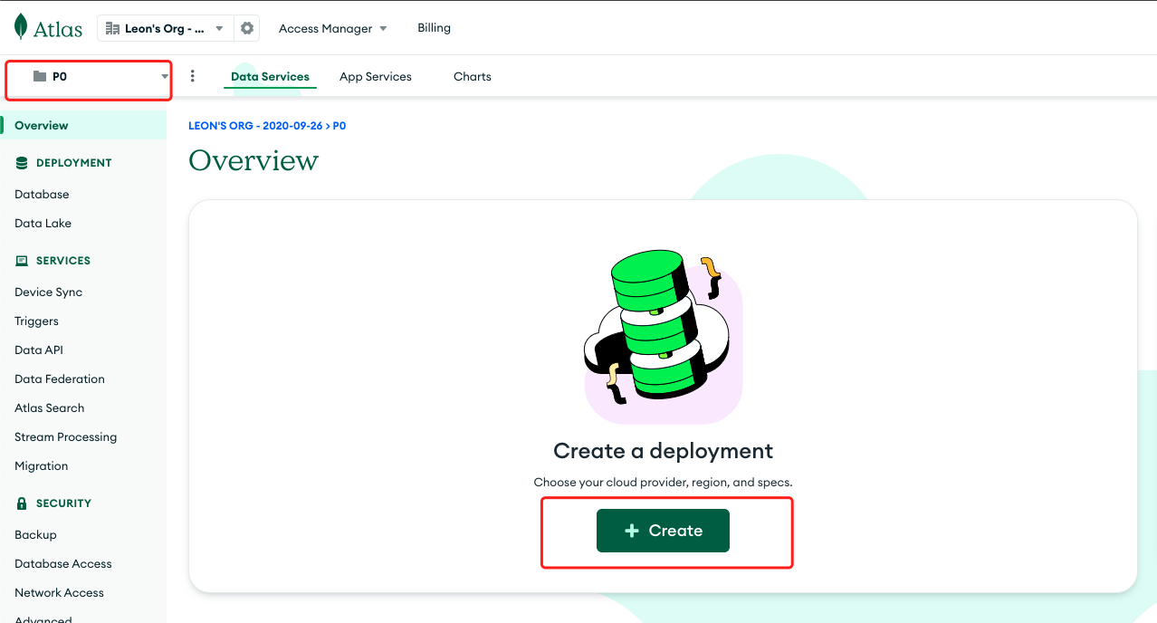 2. 第二步在刚创建的项目中,点击“+Create” 创建 MongoDB Database