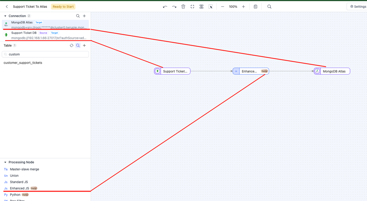 2. 拖拽我们刚才创建的源库、目标库连接到画布区域,然后在添加一个 “Enhanced JS” 处理节点,并将它们连接在一起,箭头方向表示数据流方向,如下,当我们启动任务时,数据将会从 Source Database 流向 MongoDB Atlas