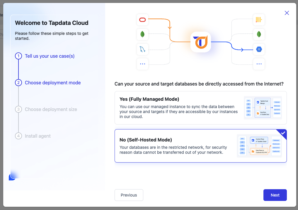 3. 第二步选择部署方式,这里需要根据您的数据源所在位置来判断选择全托管或者半托管: