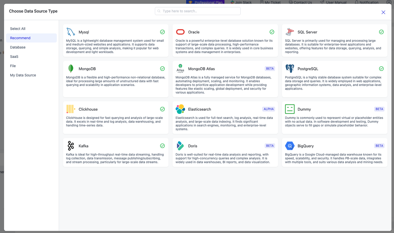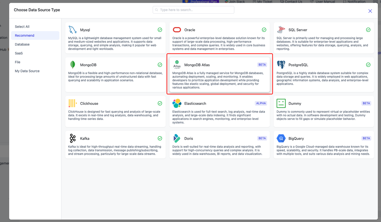 2. 根据您的源库类型(通常是指您的业务系统使用的数据库软件)选择要创建的数据源,我这里选择MongoDB