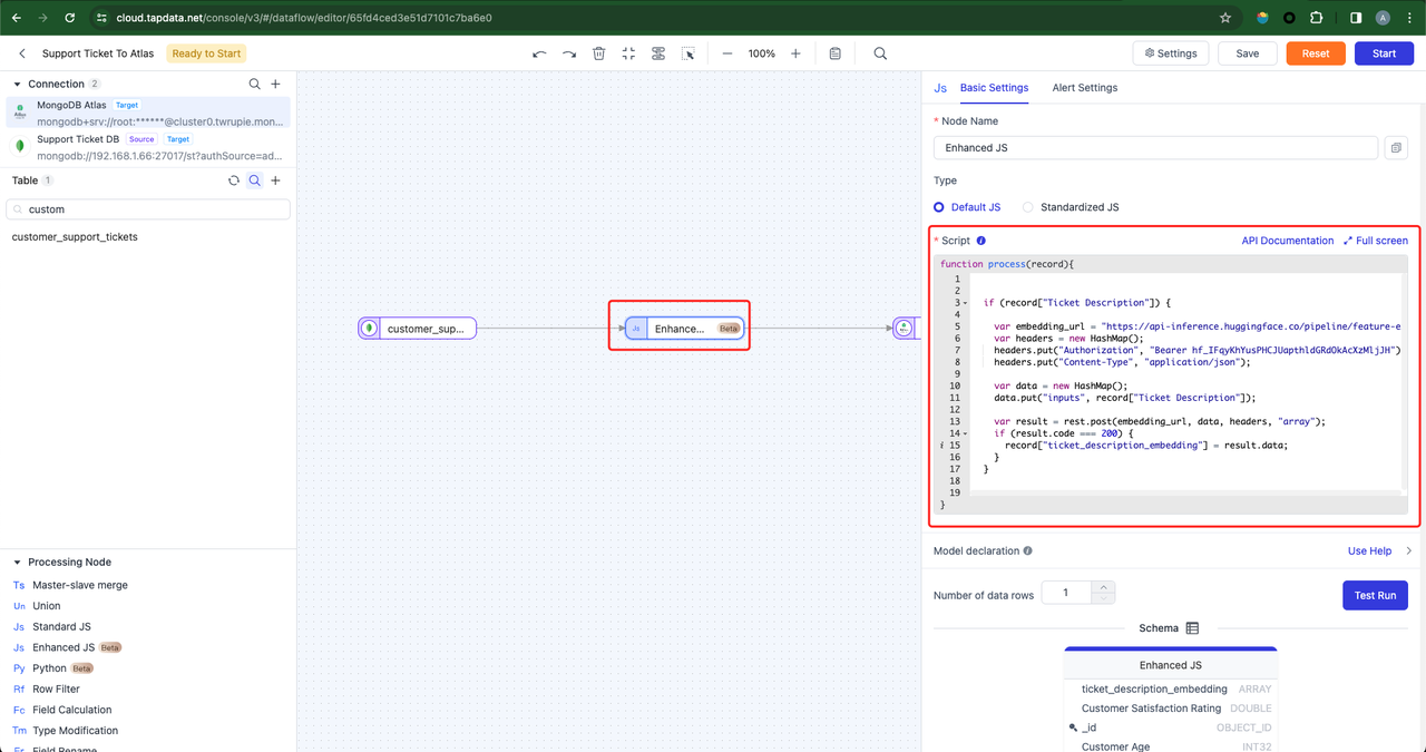 }4. 我们将在 Enhanced JS 处理器中加工处理源库读到的数据,将工单描述转为向量,然后写入到目标库,如下: