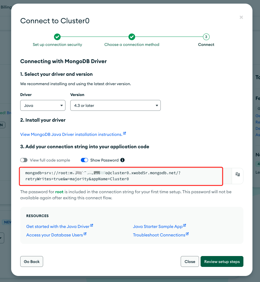 6. 选择 使用Java,然后复制 连接字符串,并保存下来