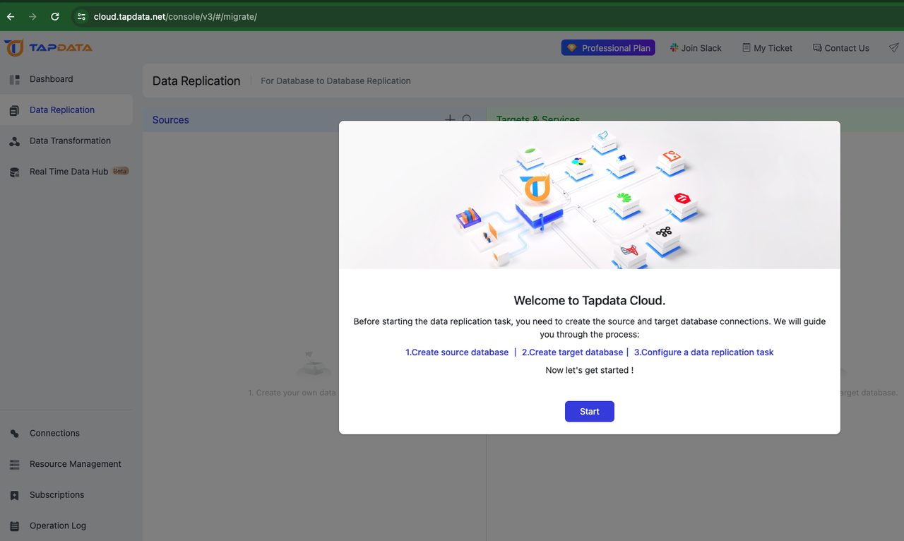 登录 Tapdata Cloud 控制台,第一次登录控制台时根据新手指引操作即可