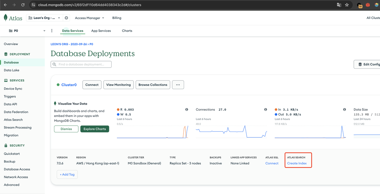 登录 MongoDB Atlas 控制台,打开 “Database”,然后点击 “Create Index”