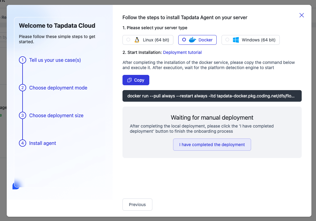 5. 第四步安装部署 Agent,我们这里使用 Docker 容器部署Agent,点击“Copy”按钮复制启动命令粘贴到本地电脑执行(需要提前安装 Docker 软件,安装方式请查看:Docker Desktop)