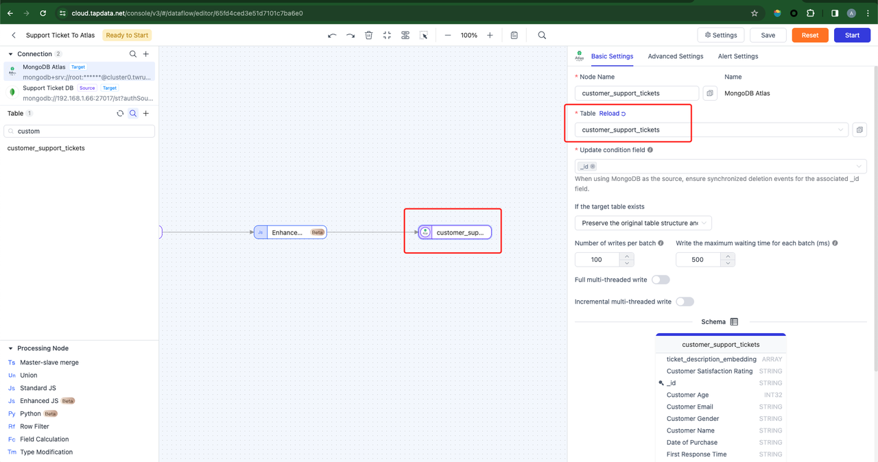 return record;源库中读取到的每一行数据,经过上面JavaScript脚本,都增加了一个 ticket_description_embedding 的字段,用来存储向量化数据,后续语义查询将会基于此字段实现,此时的数据模型如下: