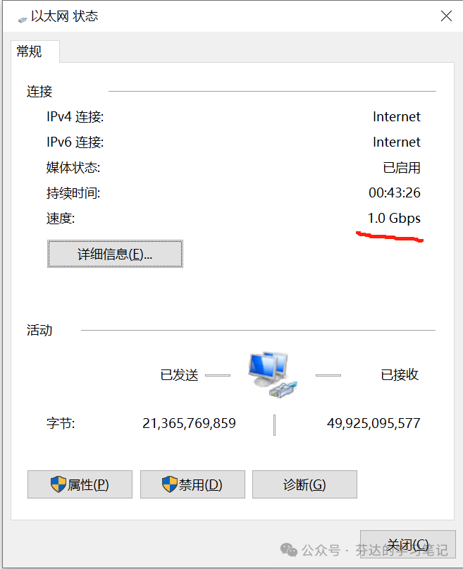 这里可以查询到本机网卡的速度,我这里是一张千兆网卡。