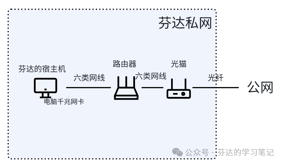 光猫在设置为桥接模式后,不再负责 PPPoE 拨号上网,而是由路由器负责。此时,光猫仅将光纤的光信号转换为网线中的电信号,工作在物理链路层。因此,我在 IP 层的网络拓扑图中直接忽略光猫,拓扑图如下所示: