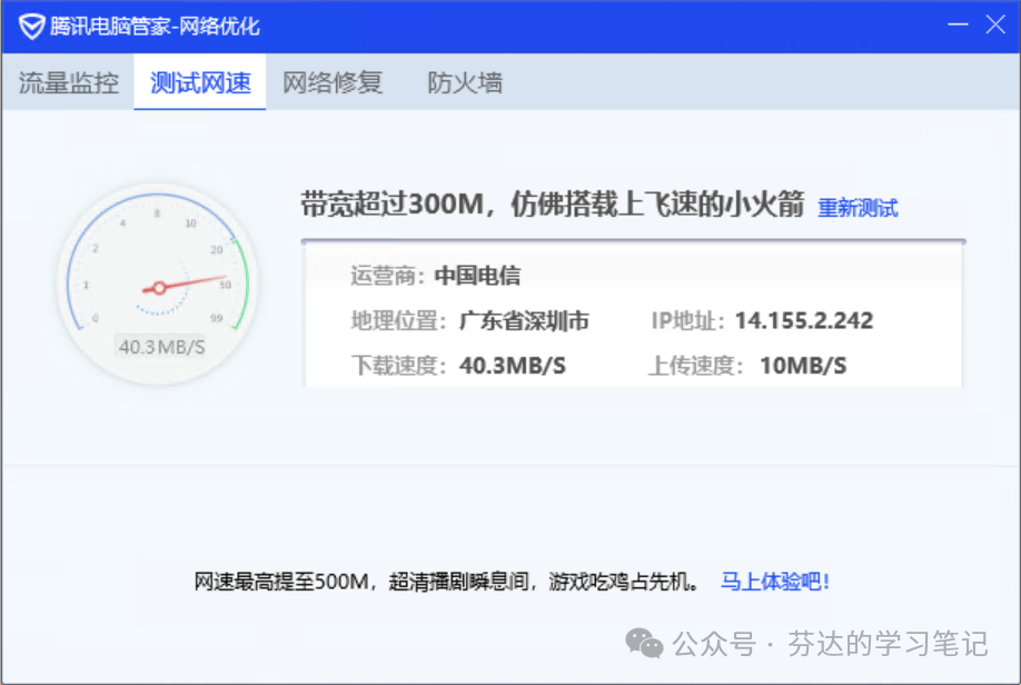 网上有很多测速网站,广告多、测速不准,甚至引导收费。最好的测试软件是腾讯电脑管家。可以看出我现在的自建私有云环境能够充分利用带宽,下行带宽约为 300 Mbps,上行带宽约为 80 Mbps。我尤其关注上传速度,因为这直接影响我能否流畅地通过远程桌面操作家里的 Windows 宿主机。一般来说,上传速度达到 2 MB/s(即上行带宽 16 Mbps)就足够流畅使用远程桌面了。