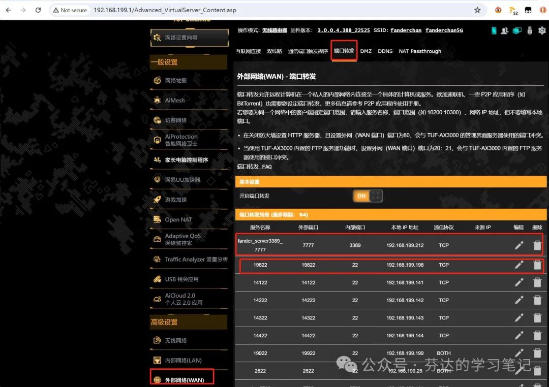 然而,我们显然不是想访问路由器,而是想访问路由器后面的那些设备,例如 Windows 系统的 3389 端口用于远程桌面,22 端口用于 Linux 的 SSH 访问。因此,必须开启端口转发功能。