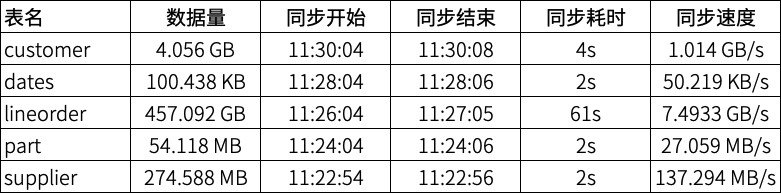 同步速度最快的为 lineorder 表:7.4933 GB/s