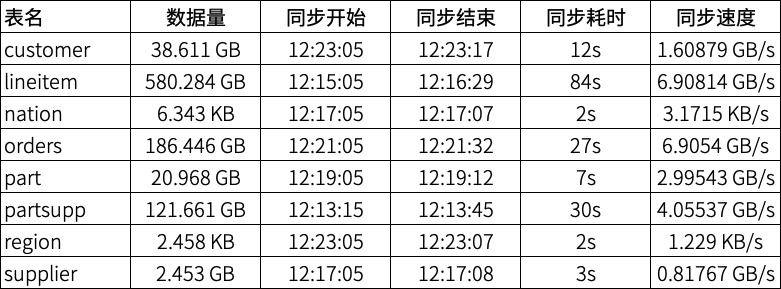 同步速度最快的为 lineitem 表:6.90814 GB/s